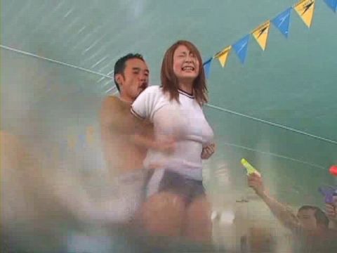 女の子たちがセーラー服やブルマ体操着やスーツにコスプレして、プールの上に敷いたマットの上で自己紹介。水鉄砲で水を掛けられて服がスケスケに。自己紹介が終わるとプールに入って、男たちに体を触られる。着エロみたいでエロいし、遠くの方で司会者の男が、待機してる女の子のオッパイ揉んだりしてる。