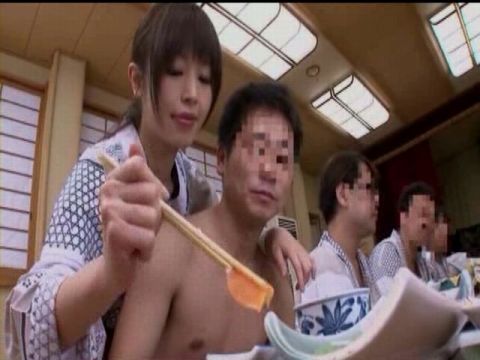 まず、まりかが皆にお酌をして回りながら、チンコを触ったり、乳首を舐めたりしてあげる。1人勃起してる男がいて、まりかが小皿のマヨネーズをチンコに塗ってフェラで綺麗に舐めてあげる。これぞプロの仕事。